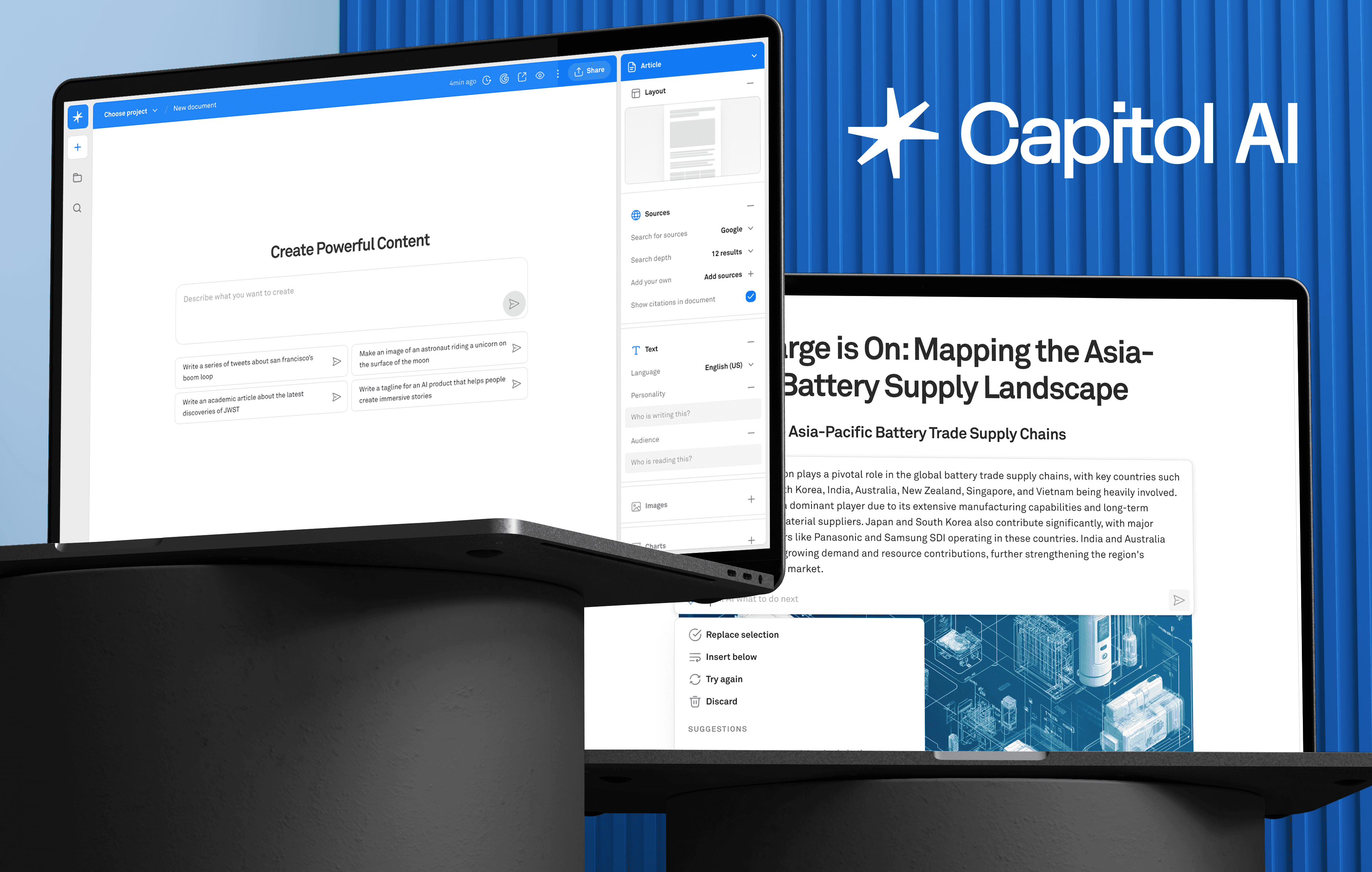 - Generates and summarizes content in custom formats, combining internal and external sources