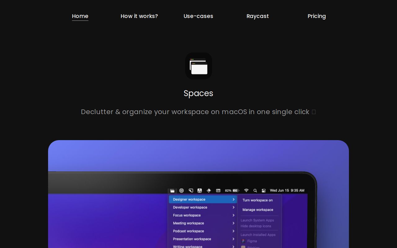 - Workspaces & Launcher: Spaces comes with two modes - Workspaces and Launcher. The Workspaces mode cleans up the user's workspace before launching a new set of apps and websites, while the Launcher mode opens a new set of apps and websites without cleaning up the workspace.